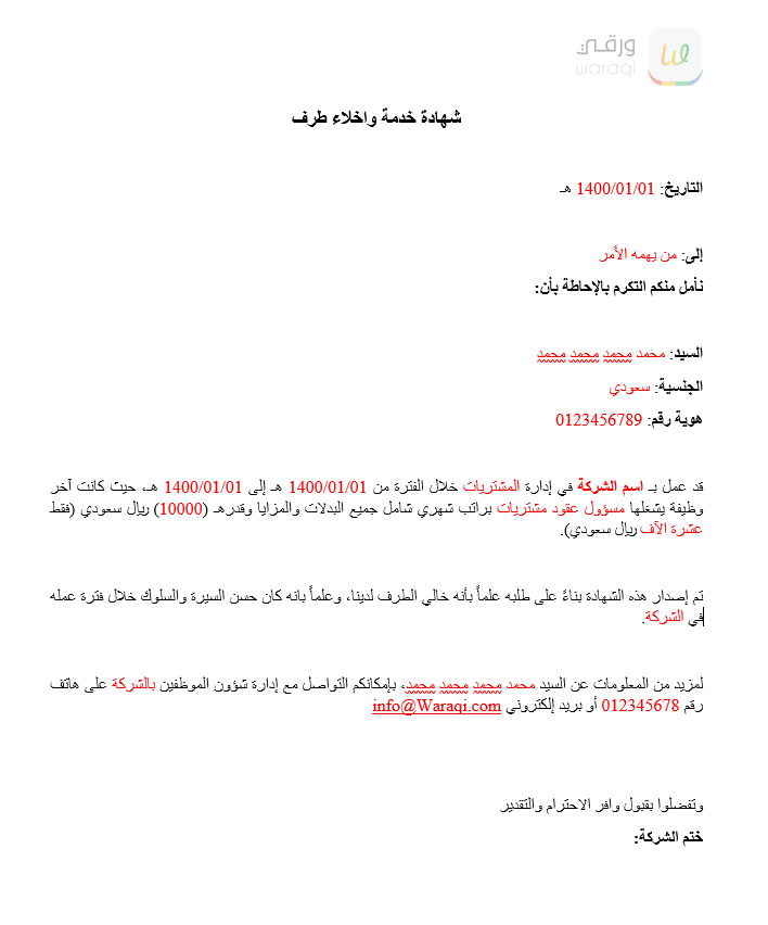 | العنوان: | شهادة خدمة واخلاء طرف |