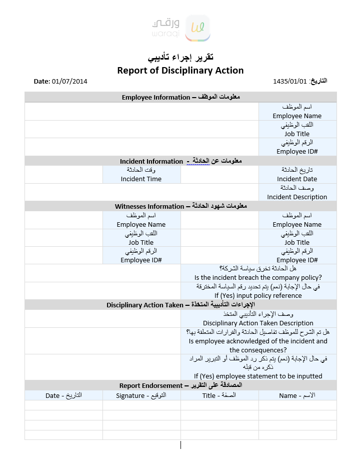 هو تقرير لرصد وتسجيل حادثة قام بها موظف وغالباً ما تكون مخالفة للأنظمة. التقرير يوضح تفاصيل الموظف المخالف والشهود وتفاصيل الحادثة والإجراء التأديبي المتخذ في حق الموظف المخالف.
