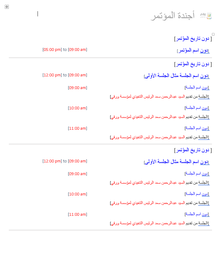 | الوصف بالعربي: | لكل حدث أجندة تبين الفعاليات المصاحبة لهذا الحدث. ولنأخذ المؤتمرات كمثال حيث ان كل مؤتمر يجب ان يكون لديه أجندة تحتوي على التاريخ والوقت وعناوين الجلسات والمتحدثين المشاركين في المؤتمر. القالب المرفق خاص بالمؤتمرات ولكن بإمكانك عمل بعض التعديلات ليتلائم مع الحدث المناسب كإجتماع عمل أو لقاء عائلة سنوي. |