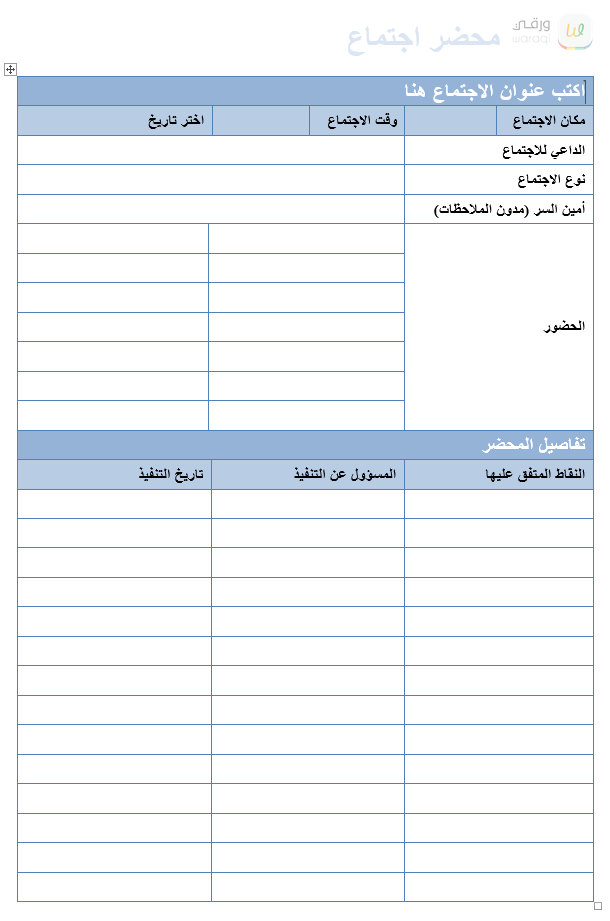 | الوصف بالعربي: | محضر الاجتماع هو لتدوين أحداث اجتماع أو جلسة استماع وكتابة أقوال المجتمعين فيه .أول ما يُكتب في محضر الاجتماع هو أسماء الحاضرين ثم سبب الاجتماع وإجابات الحاضرين بعضهم لبعض وقرارات تمت في اجتماعهم وتوصياتهم. لا بد من كتابة تاريخ الاجتماع كاملاً والساعة والمكان الذي تم الاجتماع فيه. |