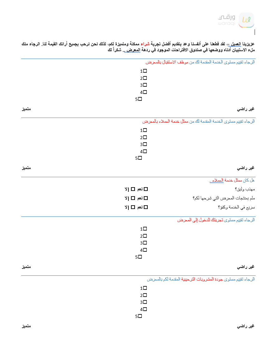 | الوصف بالعربي: | كل منظمة أو كل محل تجاري يحب أن يسمع من عميله تجربته معه، لذلك دائما ما يقومون بعملية إستقصاء أراء العملاء وذلك بإعطائهم إستبيان يبين مدى رضا العميل. القالب المرفق هو مثال على الاستبيان المستخدم في اغلب المحال التجارية والمنظمات ولكن دائما مايكون هنالك اختلاف بين الاستبيان وذلك لاختلاف طبيعة العمل ولاختلاف المعلومات المراد معرفتها من العميل من قبل التاجر او المنظمة. |