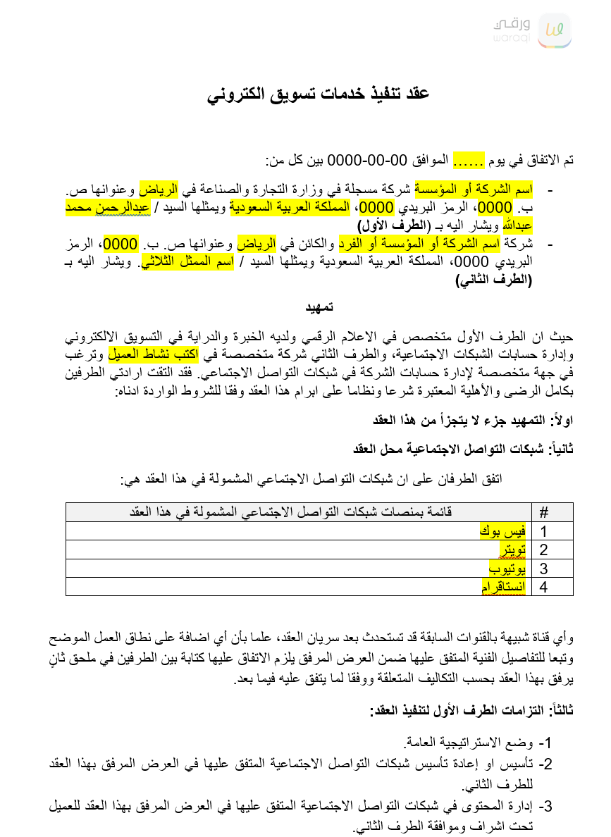 ينص هذا العقد على تحديد نطاق العمل والاتفاقات المبرمة بين طرفين لتنفيذ خدمات تسويق على الشبكات الاجتماعية