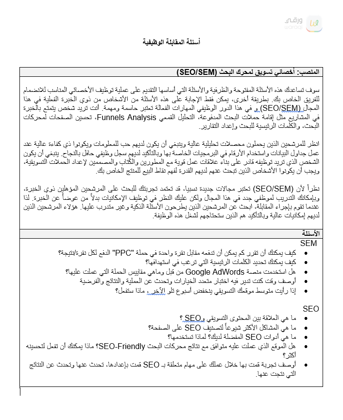 الوصف بالعربي: سوف تساعدك هذه الأسئلة المفتوحة والظرفية والأسئلة التي أساسها التقديم على عملية توظيف الأخصائي المناسب للانضمام للفريق الخاص بك. بطريقة أخرى، يمكن فقط الإجابة على هذه الأسئلة من الأشخاص من ذوي الخبرة الفعلية في هذا المجال(SEO/SEM) و في هذا الدور الوظيفي المهارات الفعالة تعتبر حاسمة ومهمة. أنت تريد شخص يتمتع بالخبرة في المشاريع مثل إقامة حملات البحث المدفوعة، التحليل القمعي Funnels Analysis، تحسين الصفحات لمحركات البحث، والكلمات الرئيسية للبحث وإعداد التقارير.