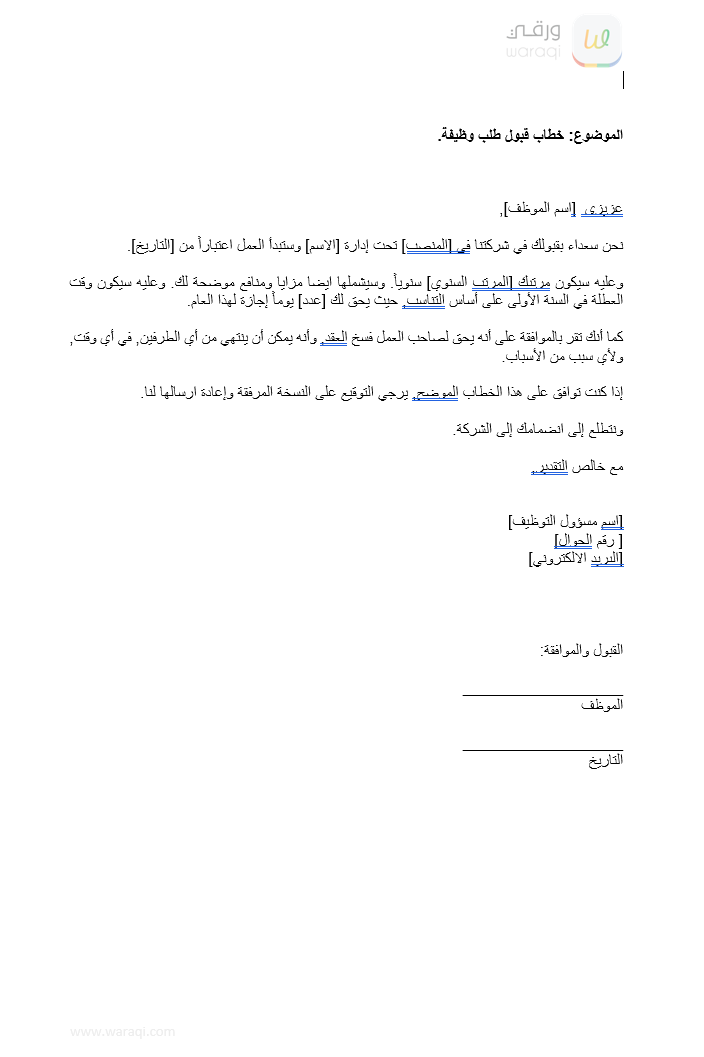 يستخدم هذا الخطاب للإرساله إلى مرشح تم قبوله لوظيفة معينة لأخذ موافقته الخطية على القبول بالمنصب المقرر له والمنافع والمزايا الوظيفية المختارة له.