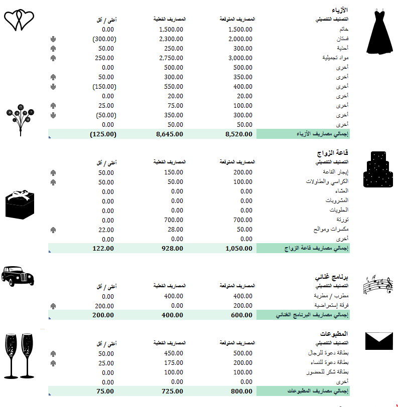 | الوصف بالعربي: | رحلة العمر بين زوجين تحتاج لترتيبات منظمة لتحقيق راحة البال يوم الزفاف. لذلك القالب المرفق عبارة عن آلة حاسبة بالإمكان إستخدامها من العريس أو العروسة لحساب المصاريف المتوقعة والفعلية وحساب الفرق في المصاريف، والغرض منها السيطرة على الميزانية المرصودة لمصاريف الزفاف بالإضافة تستخدم كأداة تذكير للمتطلبات اللازم تجهيزها ليوم الزفاف. نتمنى لكم زفافاً مباركاً ومستقبل سعيد |