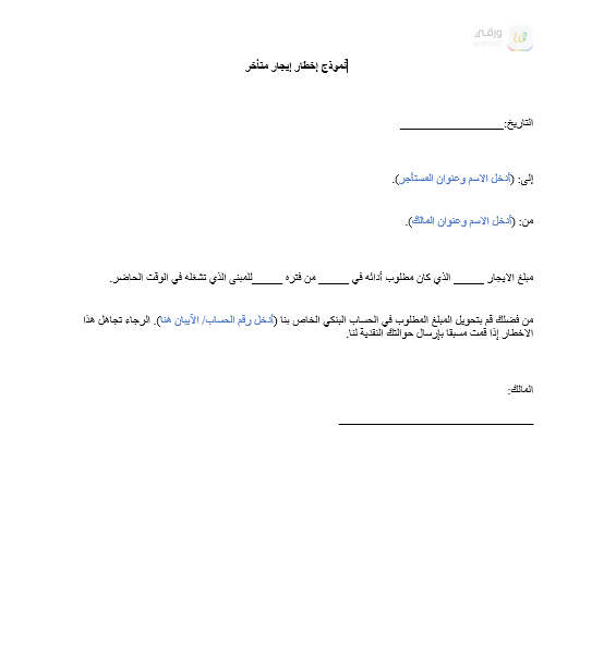 مستند يحتوي على خطاب موجهه للمستأجر بدفع مستحقاته للمالك. ويحتوي أيضاً على معلومات معينة يقوم بتعبئتها المالك مثل الحساب البنكي لكي يستطيع المستأجر دفع مستحقاته.