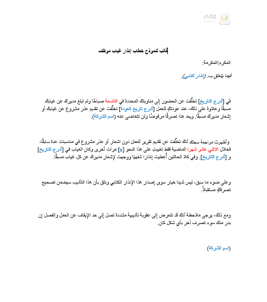 العنوان: قالب لنموذج خطاب إنذار غياب موظف