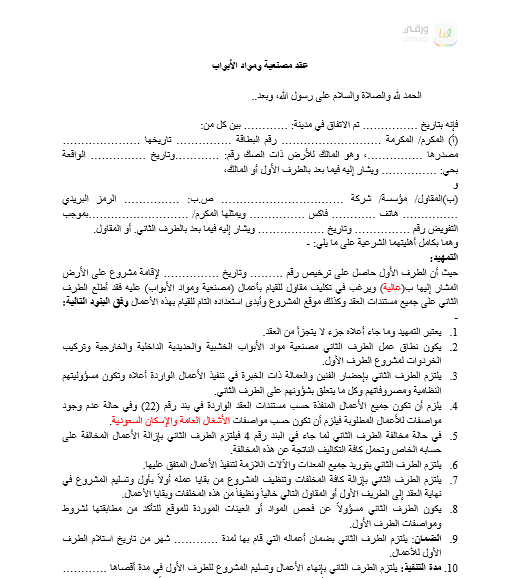 هذا القالب سوف يساعد المقاول في تحديد الخدمات التي يقدمها والاتفاقيات الازم توضيحها عند إقامة المشاريع المتعلقة بمصنعية الأبواب.