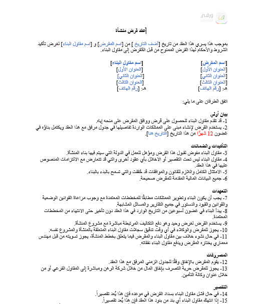 يوجد العديد من المعاملات التي تحتوي على بنود خاصة بالقروض عند البداية في إنشاء أي مشروع. هنا سوف تجد قالب يحتوي على الشروط والأحكام الخاصة بالمقرض ومقاول البناء.