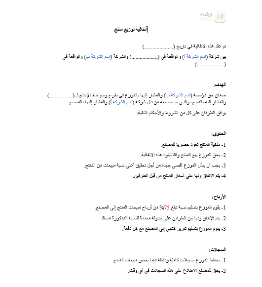 في مجال الصناعة والإنتاج هنالك العديد من الشركات التي تقوم بطرح منتجات متنوعة. نقدم لك قالب يحتوي على اتفاقية توزيع المنتج ويتضمن أيضاً البنود القانونية الخاصة بالمنتج.