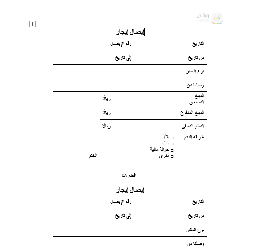 يحتوي هذا القالب على نموذج لإيصال إيجار على شكل جدول. ويتضمن المصطلحات التالية، رقم الإيصال ونوع العقار والمبلغ المستحق وغيرها من التعبيرات المتعلقة بالإيصالات العقارية.