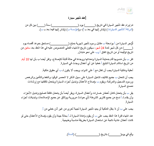 يساعد هذا القالب في حفظ حقوق كلاً من الشركة المؤجرة للسيارة والعميل. ويتضمن الشروط والأحكام القانونية المتعلقة بعقود الإيجارات.