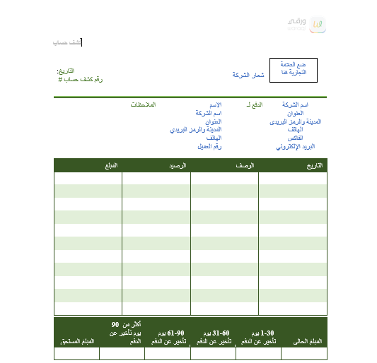 هذا القالب يحتوي على نموذج لكشف حساب بين الشركة والعميل. ويتضمن جدول لإدخال البيانات المتعلقة بالشركة والعميل والمبالغ الحالية والحوالات المالية.