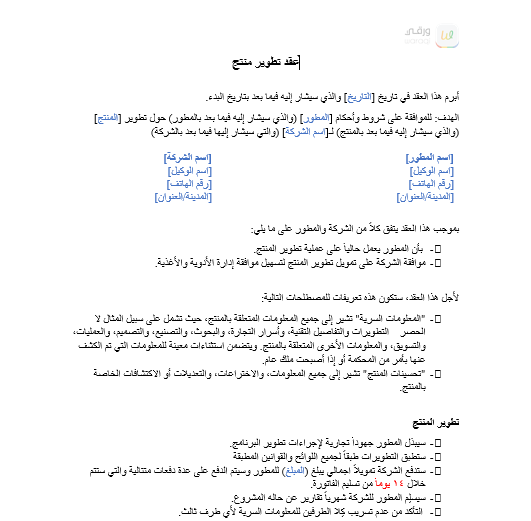 قالب عقد تطوير منتج يحتوي على الشروط والاحكام المتعلقة بتطوير المنتج وتحسينه ويهدف إلى حفظ حقوق كلاً من المطور والشركة.