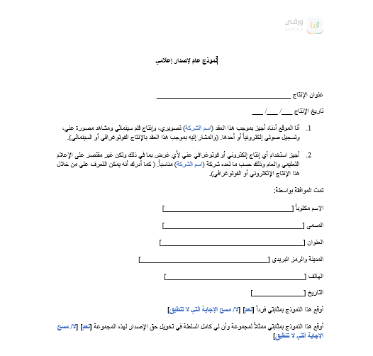 قالب يحتوي على نموذج عام لإصدار إعلامي. ويتضمن اتفاقية مبسطة لإصدار أي إنتاج الكتروني أو فوتوغرافي للعميل. بالإَضافة إلى نموذج موافقة من الوالدين للأطفال تحت السن القانوني.