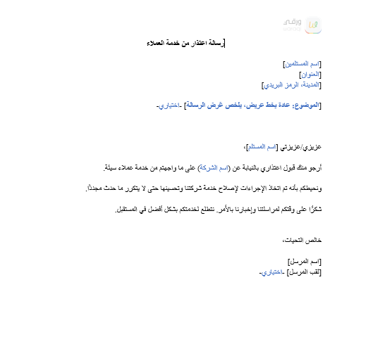 في الوقت الحالي أصبحت خدمة العملاء من أحد العناصر المهمة في نجاح أي شركة تقدم خدمات متعلقة بالعملاء. يحتوي القالب على رسالة اعتذار يمكن تعديله ليتناسب مع المشكلة التي واجهت العميل.