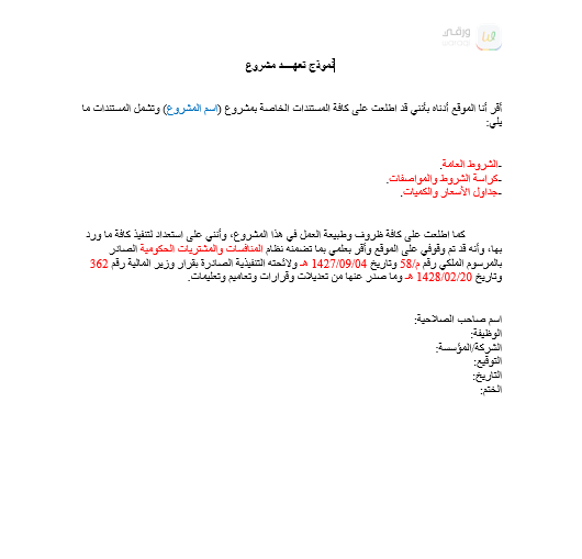 يحتوي القالب على نموذج تعهد لمشروع ويشمل خطاب تعهد بسيط.
