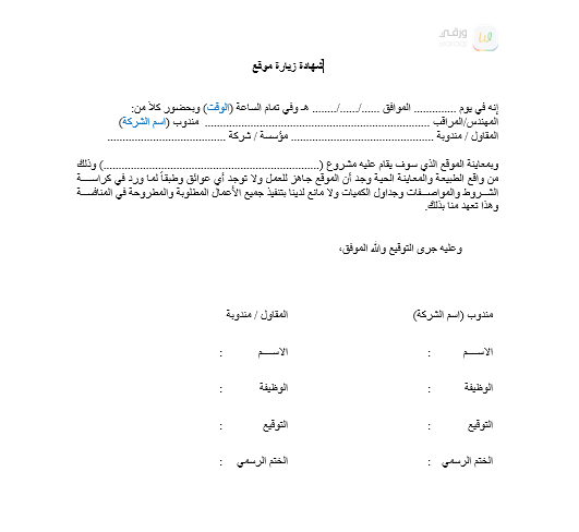 الوصف بالعربي: يحتوي القالب على شهادة زيارة موقع ويتضمن عناصر لإدراج البيانات الخاصة بالشركة والمقاول.