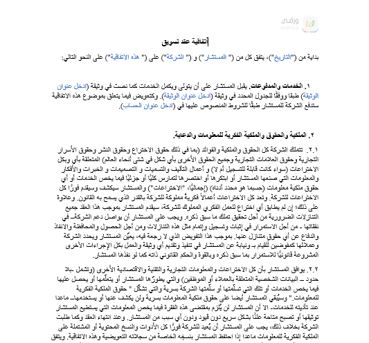 يحتوي هذا القالب على عقد تسويق مفصل، ويتضمن على الشروط والأحكام والخدمات التي يتم الاتفاق عليها بين المستشار والشركة.