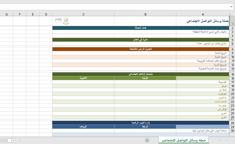 | الوصف بالعربي: | في العديد من منصات التواصل الاجتماعي. تقوم العديد من الشركات والأفراد بوضع حملات على هذه المنصات لتحقيق عدة أهداف يسعون إليها. هنا نقدم قالب يحتوي على جدول لحملة وسائل الاعلام الاجتماعي. سوف يساعدك هذا القالب في معرفة وتنظيم الأهداف المراد تحقيقها للحملة المراد التخطيط لها. |