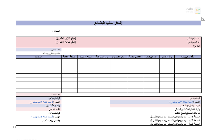 عند استلام الشحنات سوف تحتاج إلى سجل للبضائع التي قمت بإرسالها للعميل. يتضمن هذا القالب عناصر لإدراج البيانات المتعلقة بالبضاعة والوصف الخاص بها وتكلفة الشحن.
