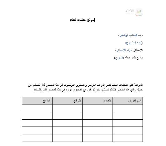 يحتوي القالب على نموذج متطلبات النظام. ويهدف إلى تخصيص متطلبات النظام التي ستتحكم في تطوير النظام وتنفيذه. ويتضمن القالب على أقسام لإدراج عناصر مثل متطلبات النظام العام ومتطلبات السياسة ومتطلبات الأمان.