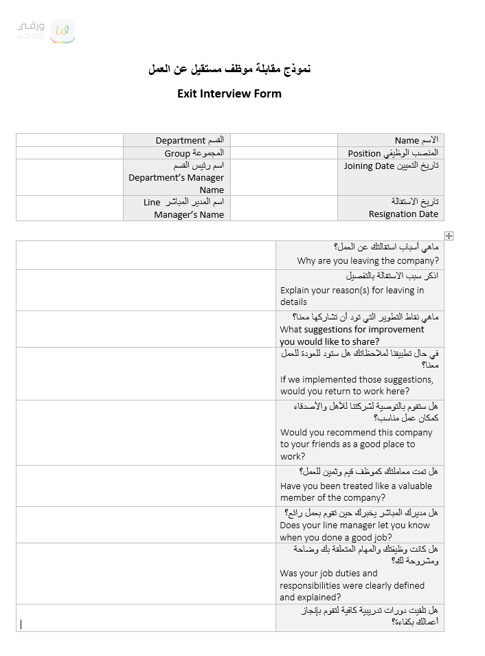 | العنوان: | نموذج مقابلة موظف مستقيل عن العمل |