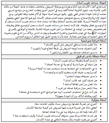 | الوصف بالعربي: | لمساعدي أطباء الأسنان دورا ثنائيا وهو إداري ورعاية المريض. وتختلف متطلبات هذه المهنة من مكان لآخر، فأحيانا يعد دبلوم الثانوية العامة كافيا بينما في أحايين أخرى يتطلب التخرج من برنامج تدريبي معتمد أو غالبا شهادة إنعاش قلبي رئوي. يكون دورهم أحيانا سهلا أو أكثر تعقيدا وفقا للقوانين. |