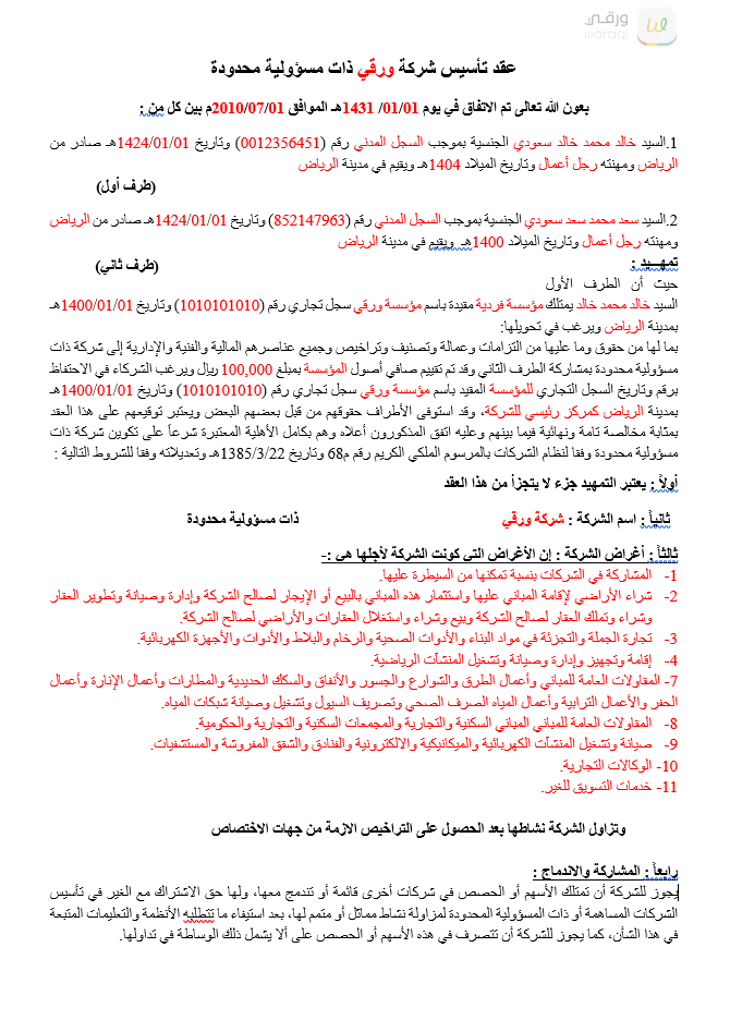 | العنوان: | عقد تأسيس شركة ذات مسؤولية محدودة |