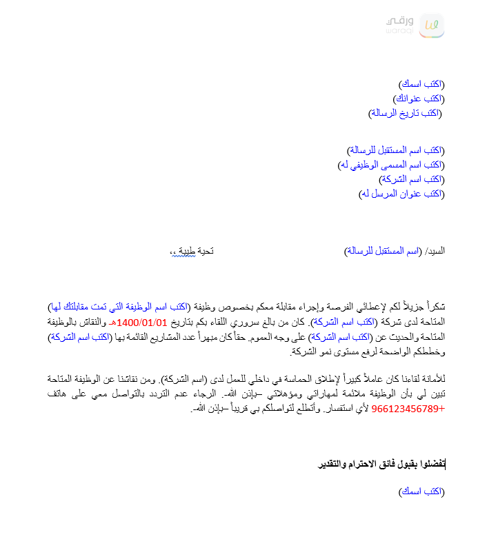 | العنوان: | رسالة متابعة لمقابلة وظيفية |