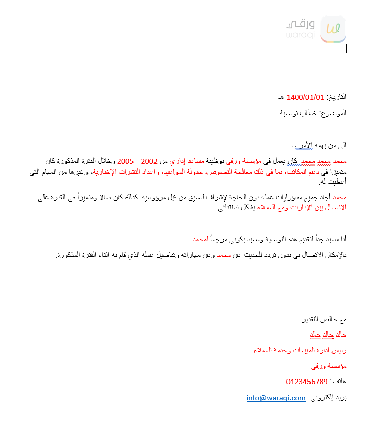 | الوصف بالعربي: | عادة يكتب هذا الخطاب من رئيس في العمل لموظف سبق العمل له مع هذا الرئيس، ويذكر فيها توصيته بان الموظف كان متميزاً طوال فترة عمله. تستخدم هذه الخطابات في دعم الموظف في حال تقدمه لأي وظيفة حيث أن هذا الخطاب يبين مدى تميز الموظف المذكور. لا توجد صياغة محددة في خطابات التوصية ولكن هذا القالب قد يكون مختصراً وشائع الإستخدام. |