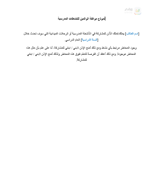 | العنوان: | نموذج موافقة الوالدين للنشاطات المدرسية |