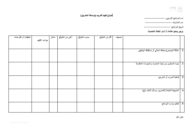| الوصف بالعربي: | ردود فعل المتدربين في تطوير البرنامج التدريبي الذي توفره الشركة لموظفيها عامل مهم وضروري. سوف يساعدك هذا القالب في معرفة ردود فعل الموظفين لديك بشأن البرنامج التدريبي الذي قاموا بالمشاركة به وسوف يساعد الشركة بأن تكون في عملية تطوير مستمرة لأنشطتها التدريبية في المستقبل حسب أراء وردود الفعل. |