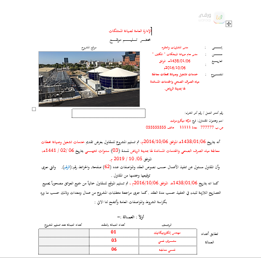 العنوان: محضر تسليم موقع محطة المعالجة الجديد