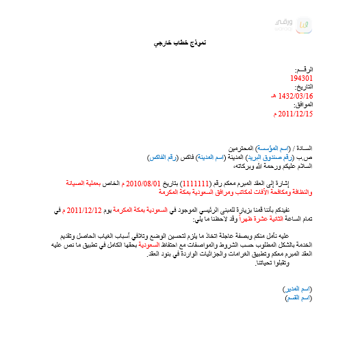 يحتوي القالب على نموذج خطاب خارجي وذلك لغرض مخاطبة خارج الشركة بصفة رسمية. ويتضمن صيغة مفتوحة لإدراج البيانات المتعلقة بالخطاب وغرضه.
