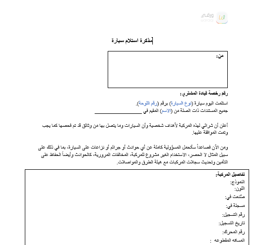 يحتوي القالب على مذكرة استلام سيارة ويتضمن على اتفاقية بيع بين البائع والمشتري وعناصر لإدراج تفاصيل المركبة.